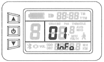- Modo 3: voltaje de la batería (VOL, indicador 12), tiempo total (TTM, indicador 9) y velocidad máxima alcanzada (MXS, indicador 12).